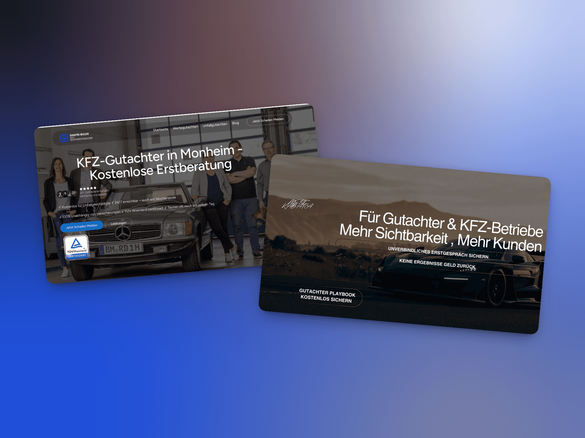KFZ-Gutachter und KFZ-Betriebe, die online sichtbar sind und eine klare Website haben, gewinnen mehr Kunden — Mehr Sichtbarkeit, mehr Anfragen, mehr Umsatz.